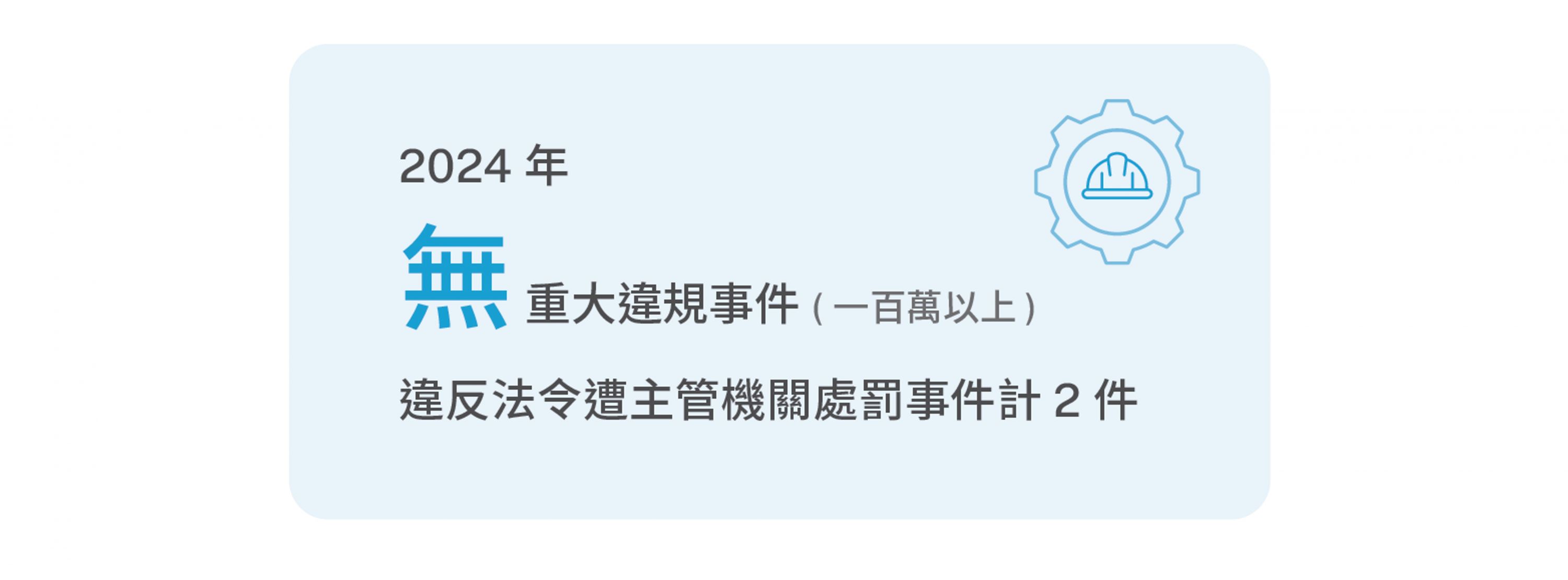 2024 年職業傷害所造成的死亡比率 ( 0 )、失能傷害頻率 ( 0.47 ) 、失能傷害嚴重率 ( 7 ) 及總合傷害指數為 ( 0.06 ) ,發生件數較 2023 年多 3 件。員工職災計 5 件、承攬商職災計 3 件,共造成 8 人失能傷害。