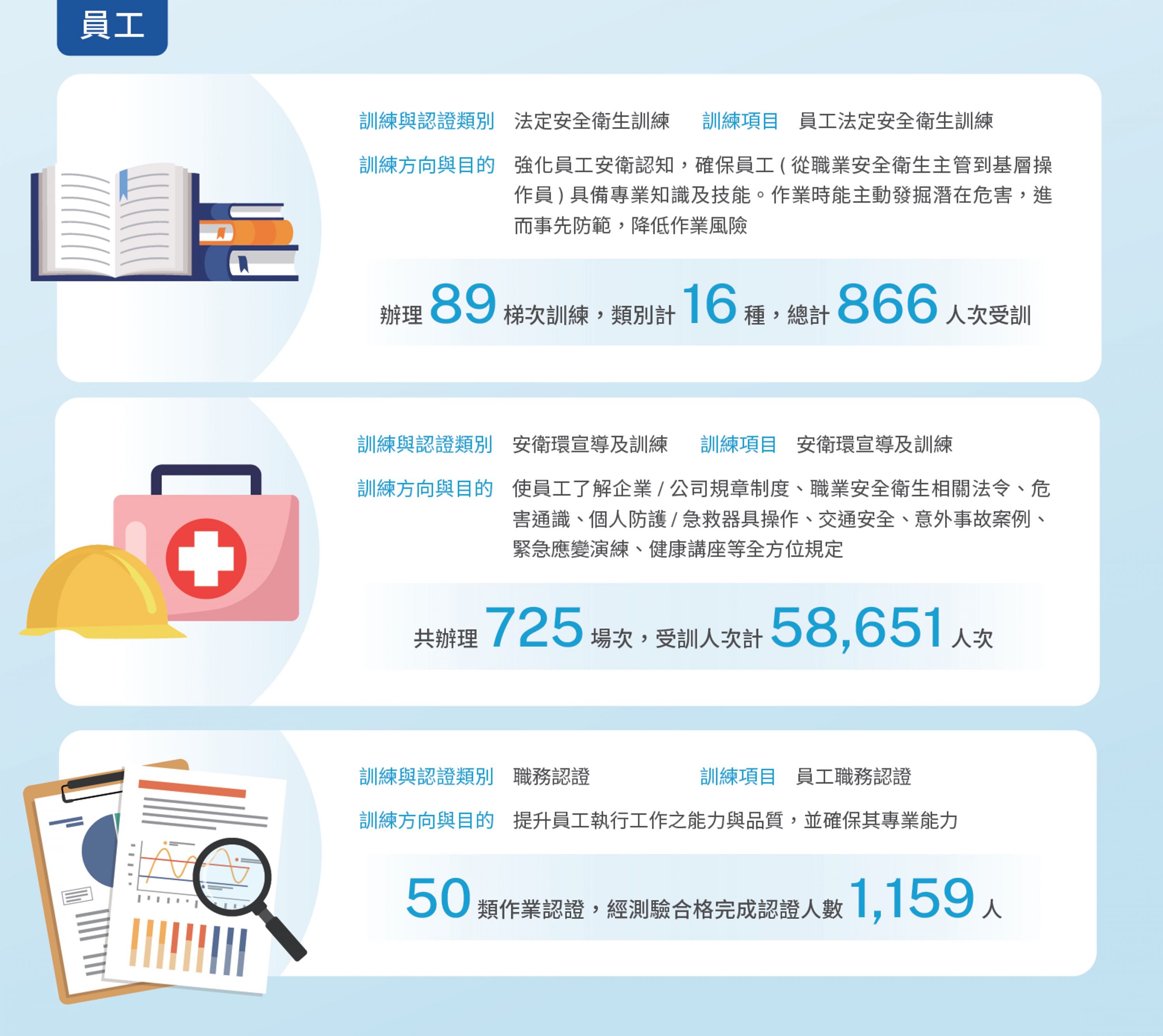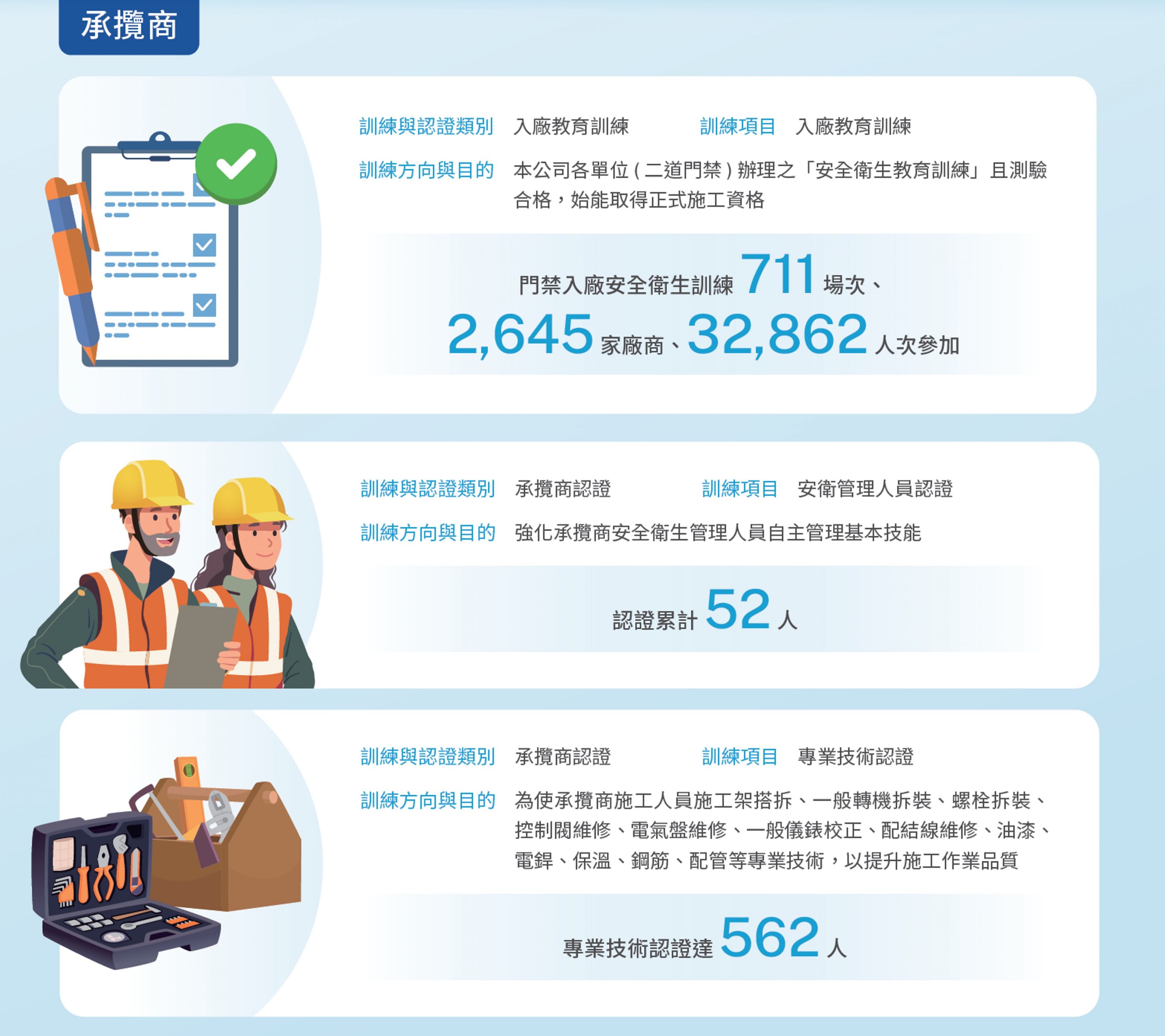我們透過紮實的訓練,讓員工及承攬商強化專業知識及技能,進而提升各項作業安全及品質,降低異常率,達到製程安全、穩定及連續運轉的目標。