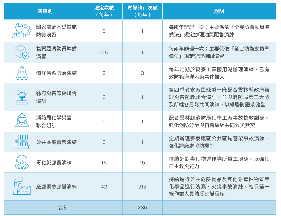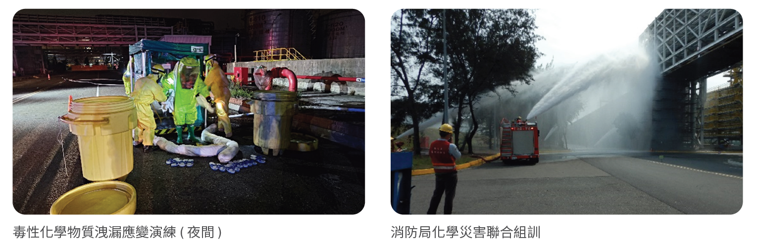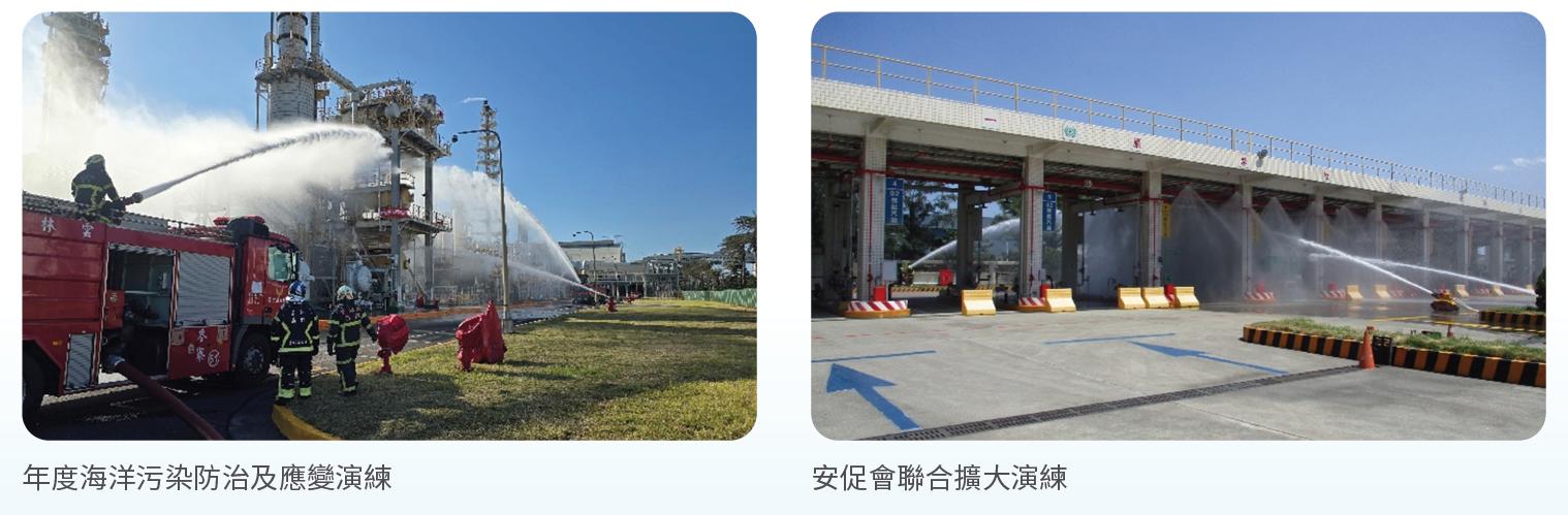 本公司除依法每半年辦理緊急應變演練 1 次,六輕廠區每年固定辦理縣府聯合災變演練、安全衛生促進會聯合擴大演練、海洋污染應變演練、公共區域管架演練及不定期辦理全國毒性化學物質災害應變、國家關鍵基礎設施防護指定演習與雲林縣消防局化學災害聯合組訓等大型演練,透過跨部門聯合演練提升救災默契並強化聯防組織互助與協防機制。