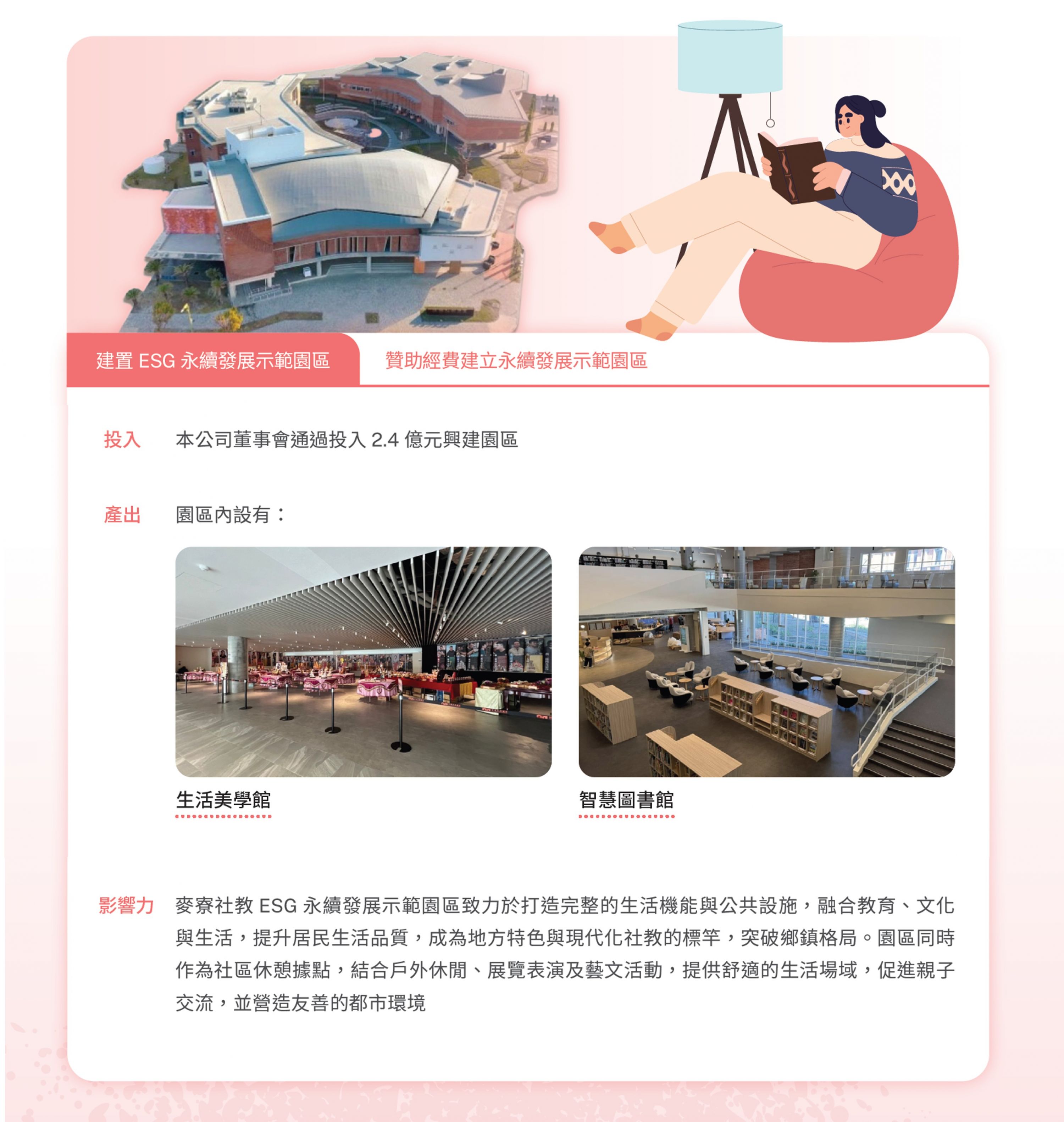 「麥寮社教ESG 永續發展示範園區」預計於2025 年1 月21 日( 二) 盛大開幕。由集團與麥寮鄉公所共同推動,總經費達6.2 億元,台塑集團共同投入4.79 億元興建園區建築。體現企業與地方協力打造永續社區的願景,共同締造「廠鄉一家親」的合作典範。