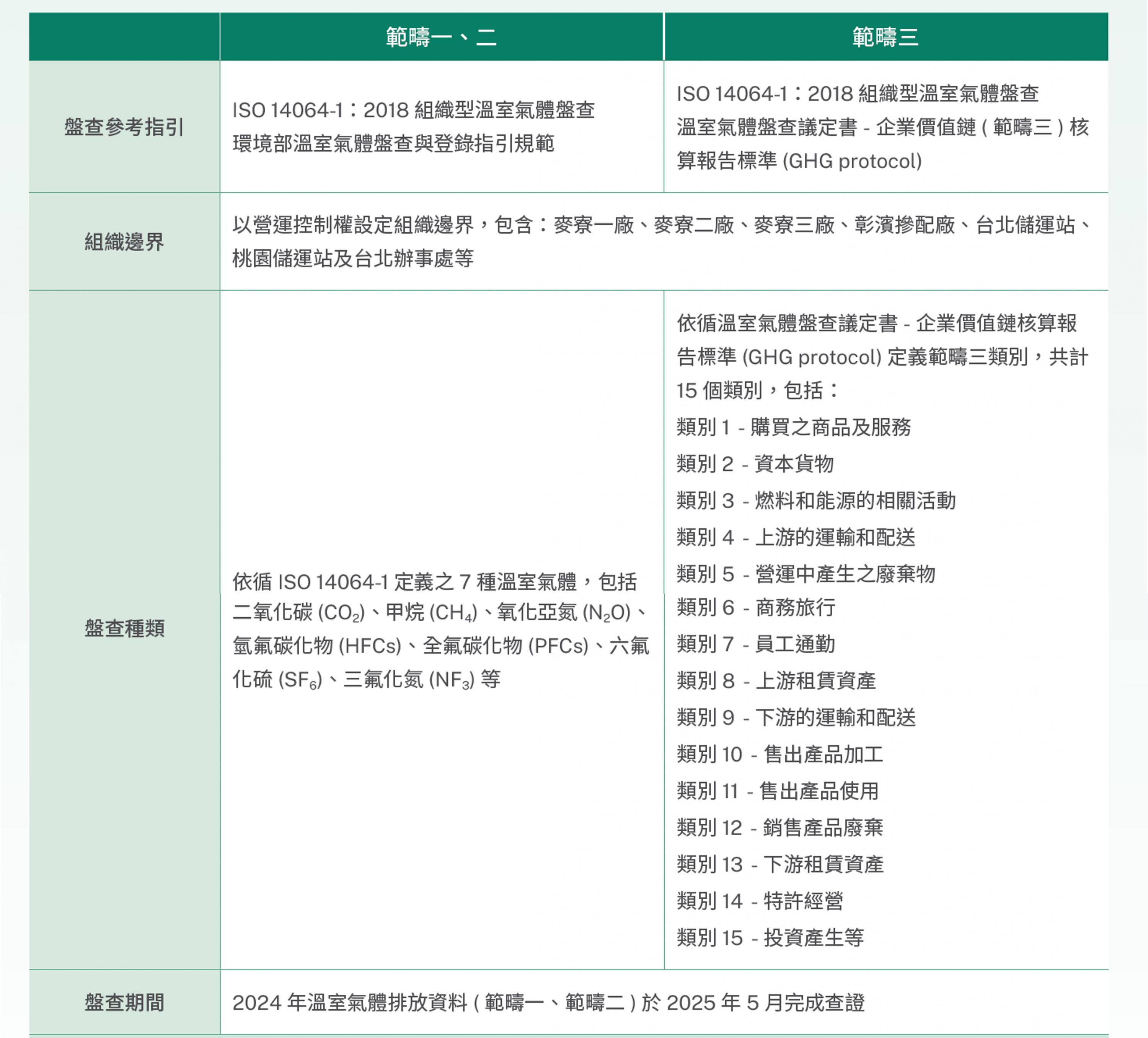 本公司依循ISO 14064-1:2018 標準進行溫室氣體的盤查,並委由BSI Taiwan 依據ISO 14064-3:2019 方法進行查證。