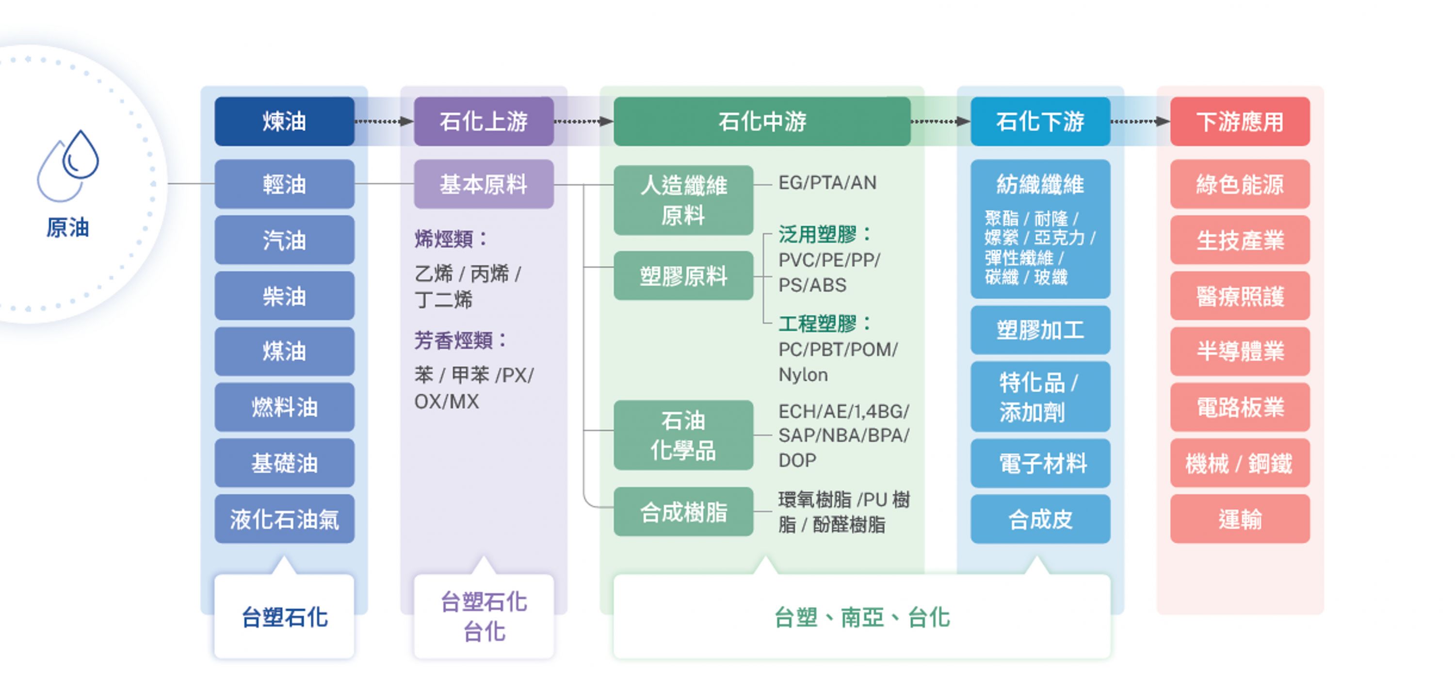 石化產業概分為基本原料、中間原料及下游應用加工製品,彼此關係相當密切,台塑石化位於產業鏈的 上游,主要原料為國外進口之原油,產品則為各式油品及石化基本原料。