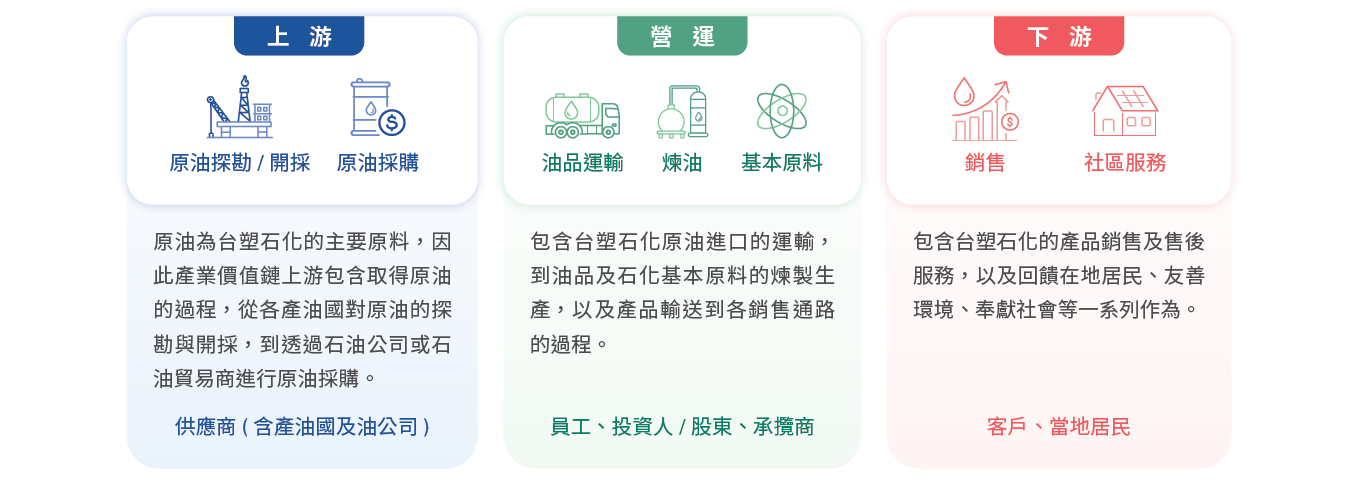 台塑石化所在之產業,以及於價值鏈中所扮演的角色與往年相同。我們期待透過產業鏈的鑑別與評估, 以宏觀的角度解析產業全貌,評估未來營運方向及擬定相關行動方案,持續與利害關係人的溝通、議合。
