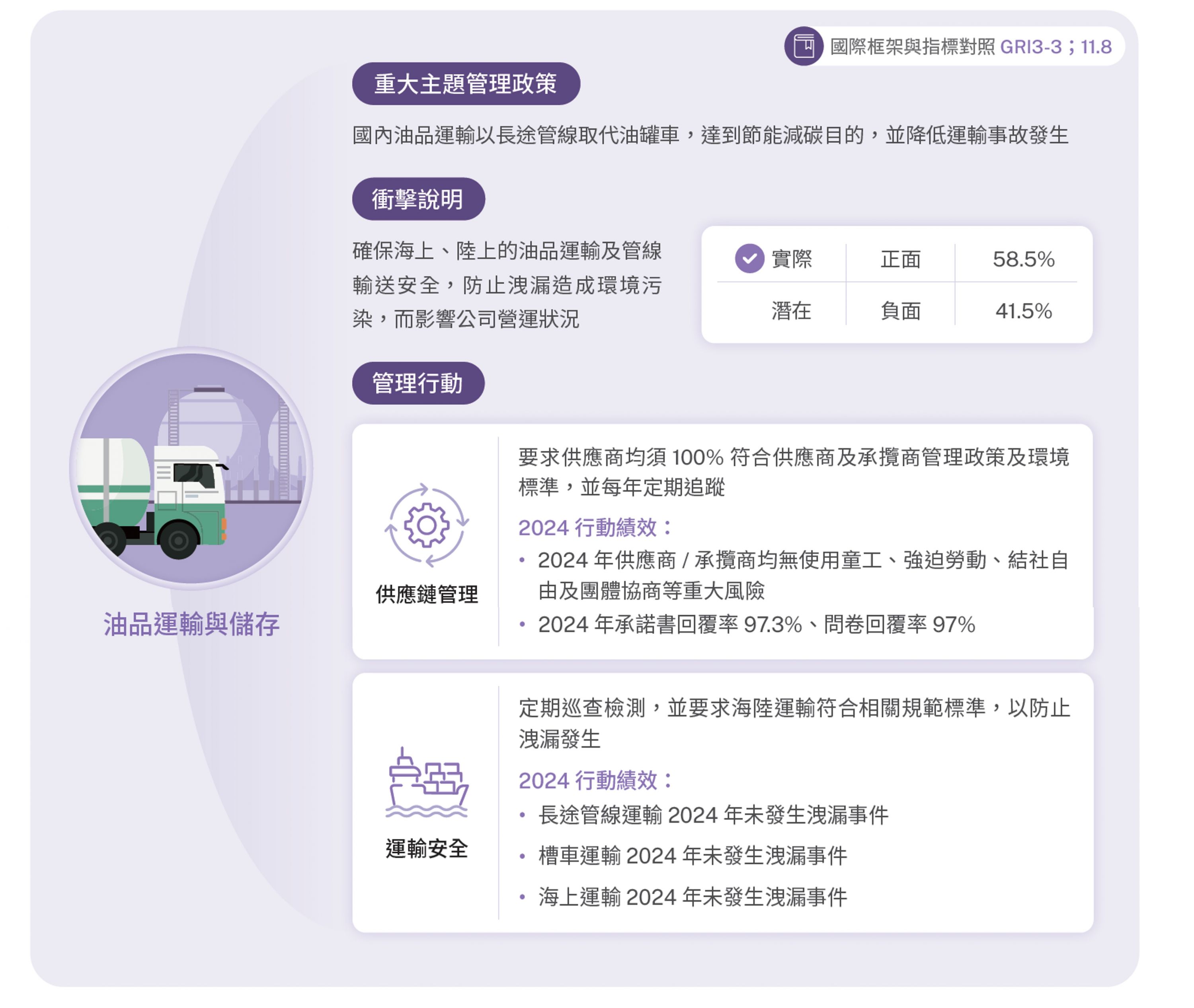 本公司2024 年總採購金額中當地採購佔比為8%,是因行業的特殊性,主原料( 原油、輕油) 均需仰賴進口,並佔所有採購金額的90%,若不含主原料採購金額當地採購佔比為74%,原料採購影響公司甚鉅,在維持原料供給的穩定上,本公司採取下列方式: