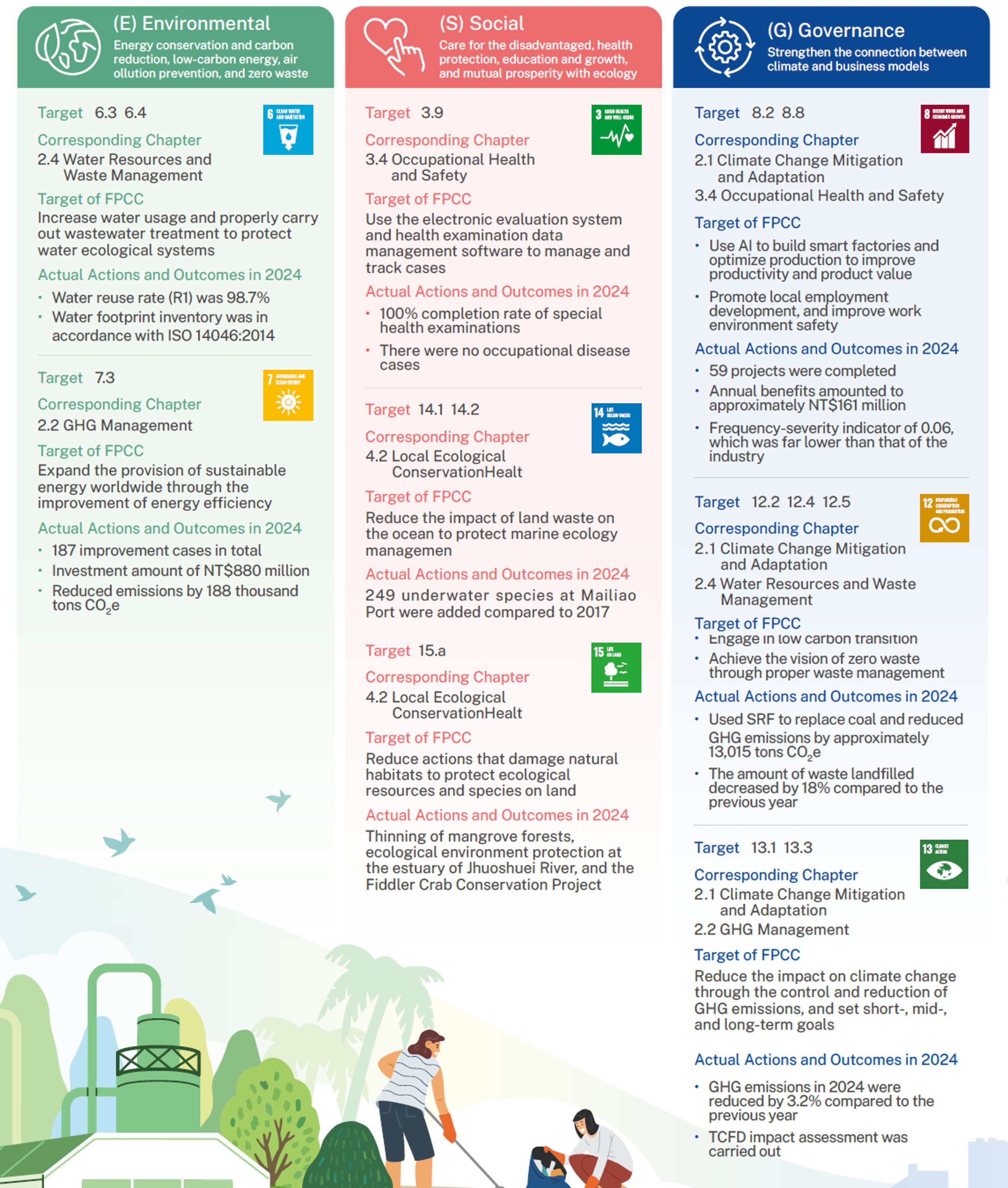 Impact of the Sustainable Development Goals (SDGs) FPCC follows international trends in sustainability issues closely and comprehensively reviewed the connection between its sustainability practices and the 17 SDGs of the UN. The SDGs are integrated with FPCC's material sustainability issues for a comprehensive evaluation, sequentially incorporating the SDGs into the decision-making process for corporate sustainvability, thereby laying out a blueprint for sustainability. The Company identified 8 SDGs to provide the framework for the sustainability blueprint. After a comprehensive evaluation of global sustainability trends, industry issues, and material sustainability issues, the SDGs were prioritized and incorporated into the sustainability strategies and policies of business plans.