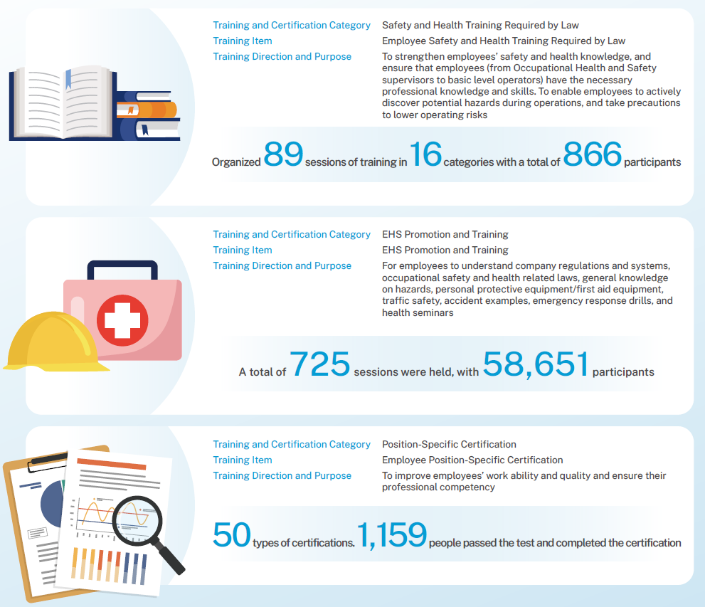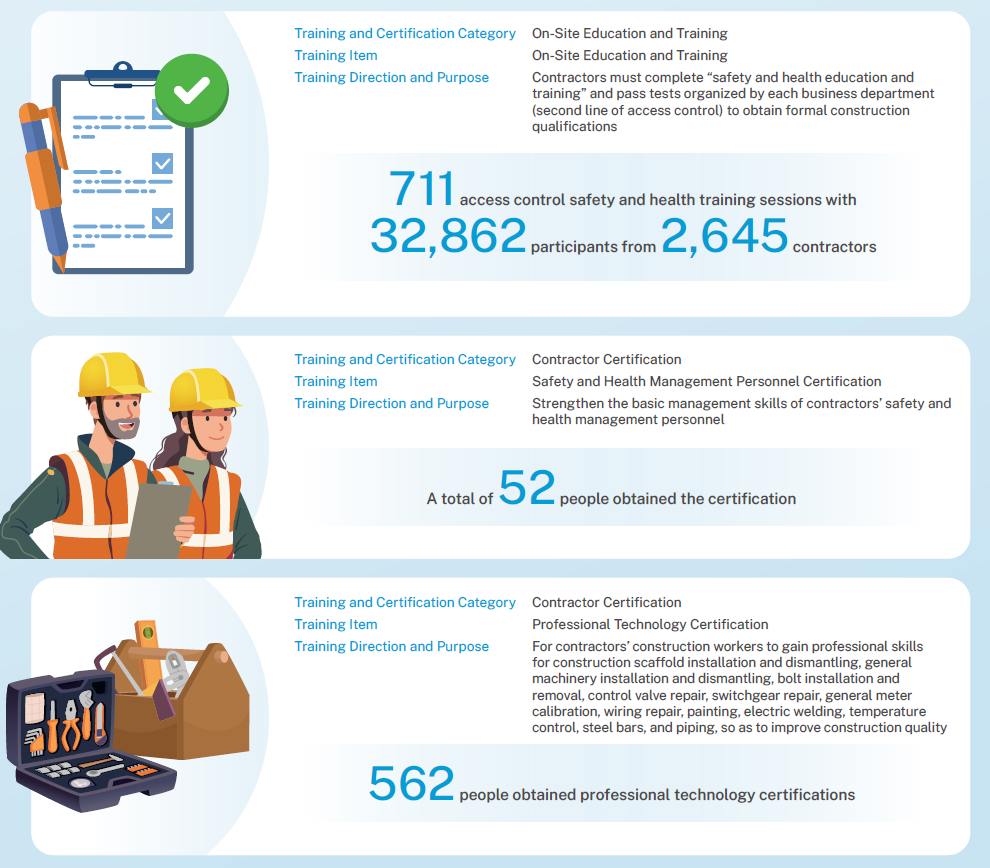 Employee and Contractor Professional Training and Certification We improve the specialized knowledge and skills of employees and contractors through solid training, and further improve operational safety and quality, lower abnormality rate, and achieve process safety, stability, and continuous operation.