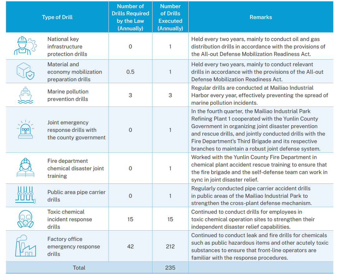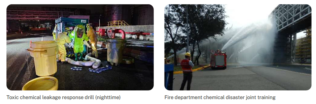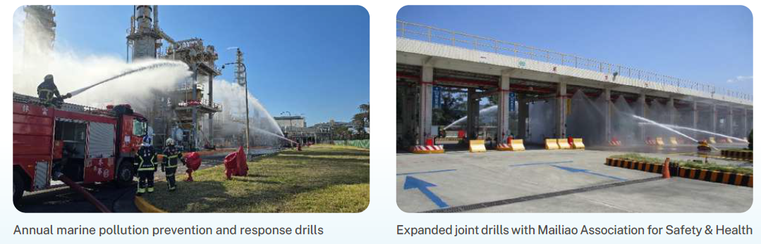 Besides organizing emergency response drills every six months, the Sixth Naphtha Cracker conducts joint drills with the county government every year, expanded joint drills with Mailiao Association for Safety & Health, ocean pollution response drills, public area pipe carrier drills, irregular national toxic chemical substance disaster response drills, national key infrastructure protection drills, and joint chemical disaster training with Yunlin County Fire Department. The cross-departmental joint drills allow departments to work better together in disaster relief, while strengthening the mutual assistance and joint defense mechanisms of joint defense organizations.