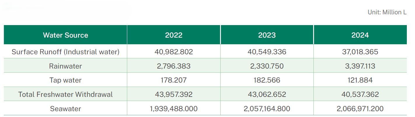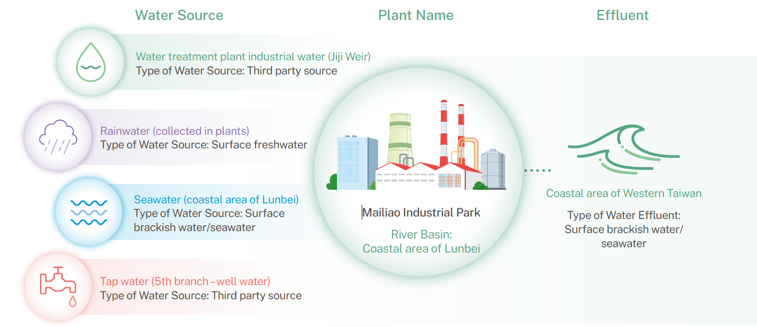 Our plants have three types of water sources, specifically third party sources, surface freshwater, and seawater. The wastewater (sludge) discharged after treatment along Taiwan's west coast includes third party terminals and seawater