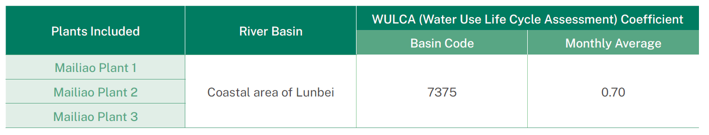 The AWARE method is used for assessing water resource risk and impact assessment. The method assumes decreasing water supply in each area to assess the potential effect of water shortage on human beings or the ecosystem (Boulay et al. 2018). The method divides Taiwan into 23 areas, which are shown in the figure below, in which Yunlin County is not an area with high risk of water shortage (water consumption is lower than the global average 75% of the time). Based on the method proposed by Boulay et al. (2018), we divided Mailiao Plant into the following areas: