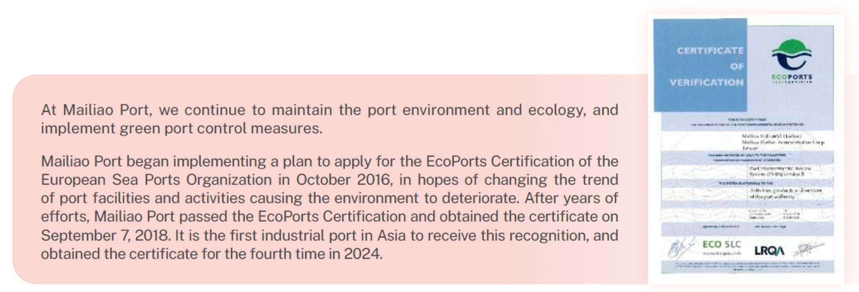 Mailiao Port began implementing a plan to apply for the EcoPorts Certification of the European Sea Ports Organization in October 2016, in hopes of changing the trend of port facilities and activities causing the environment to deteriorate. After years of efforts, Mailiao Port passed the EcoPorts Certification and obtained the certificate on September 7, 2018. It is the first industrial port in Asia to receive this recognition, and obtained the certificate for the fourth time in 2024.