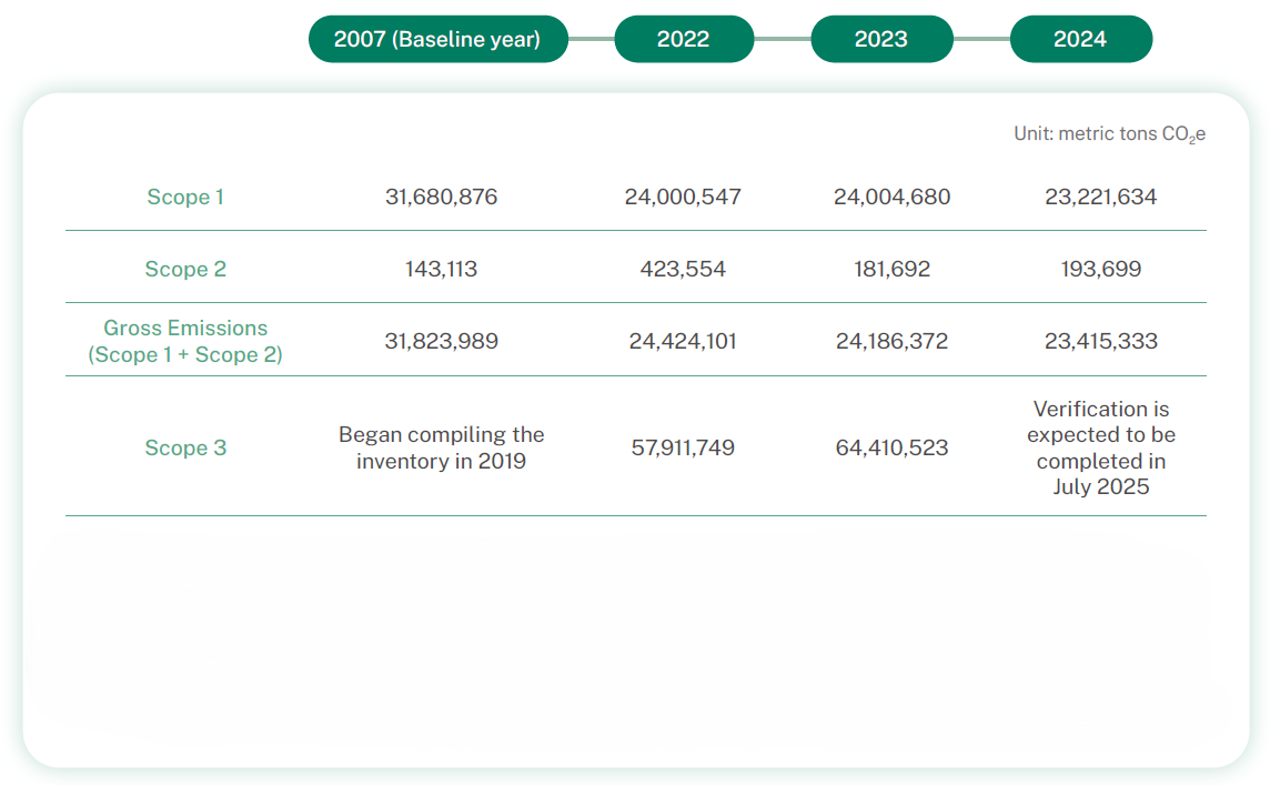 Note 3: Global warming potential (GWP) before 2016 is based on the second assessment report (SAR) of IPCC in 1995. GWP from 2016 to 2022 (inclusive) is based on the fourth assessment report of the IPCC in 2007. Starting from 2023, in accordance with the Ministry of Environment’s Guidelines for Greenhouse Gas Emission Inventory, GWP is based on the fifth assessment report of the IPCC in 2013. The emission factors for electricity and steam are in-house factors that have been validated by verification institutions