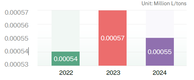 The effluent volume generated throughout 2024 was 43,000 tons per day. The quality of water eventually discharged into the Taiwan Strait met effluent standards after wastewater treatment. The volume of wastewater discharged per unit of product in 2024 was 0.00055 million L/ton, showing steady fluctuation. In the future, we will continue to evaluate and develop wastewater recycling and reuse (e.g., collecting process sour water to the FGD system) and wastewater treatment facility modification to increase the volume recycled, in order to continue reducing the wastewater discharge per unit product.